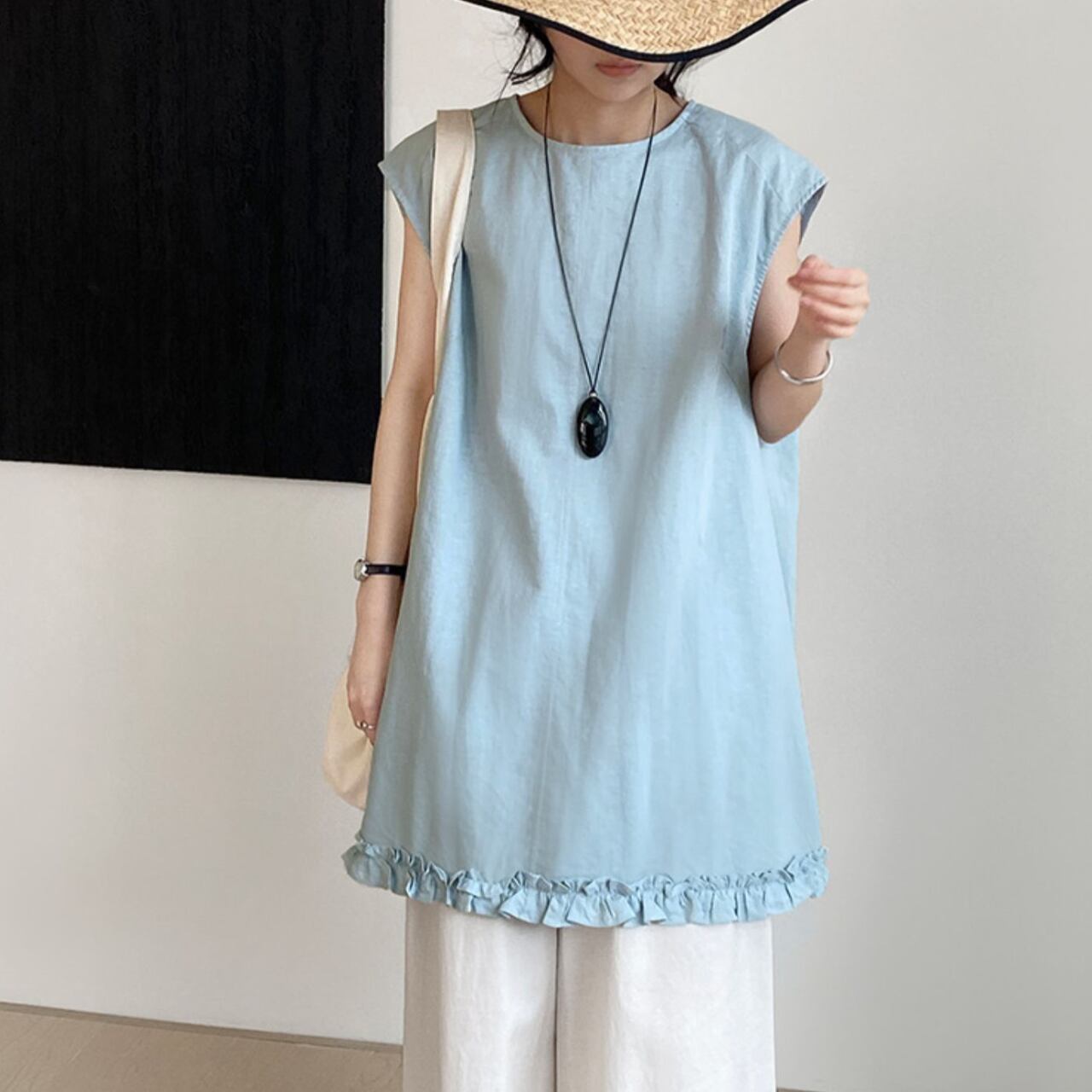 バックボタンフリルヘムノースリーブトップス 01368
