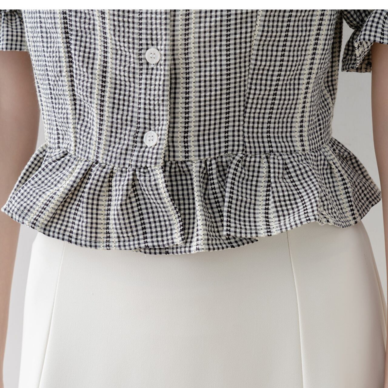 上品なギンガムチェック柄と繊細なレース襟の組み合わせが魅力的なブラウス。