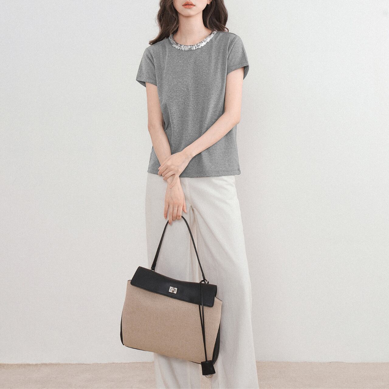 首元のスパンコールが、さりげなく華やかさをプラスしてくれるTシャツ。